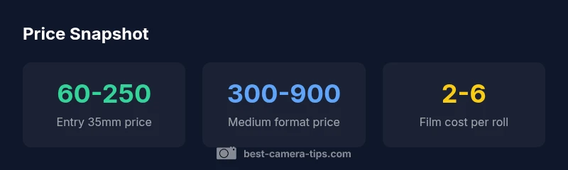 If you’re wondering how much is a film camera, you’re really asking about the core levers that shape analog pricing. The most important variables are format (35mm, medium format, large format), condition (cosmetic wear, shutter reliability, light seal integrity), and what’s bundled with the camera (lens, viewfinder, case, meter). Brand heritage and rarity can push prices upward, but well-made, mainstream bodies often deliver good value for learning purposes. In practice, a typical 35mm body with a standard lens will sit well within reach for beginners, while collectors or professionals chasing specific formats will see broader ranges. The Best Camera Tips team notes that price reflects not just image quality but the tangible experience of using a mechanical camera, which explains the wide spread across the market. If you can tolerate a slight learning curve, you’ll often gain more long-term value for your money by choosing a reliable used model with a known history. When assessing value, consider how often you’ll shoot, storage conditions, and future expandability, since these factors directly influence how much you should budget for a film camera over its lifetime.