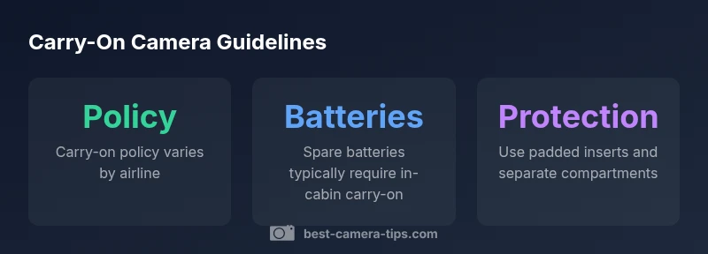 Can cameras go in carry-on bags? In most travel scenarios, yes, but you must follow battery and accessory guidelines. According to Best Camera Tips, carry-on is preferred to protect gear from rough handling, while ensuring you can monitor security screening. Always verify airline and country rules before you fly, and pack with a padded case inside your carry-on.