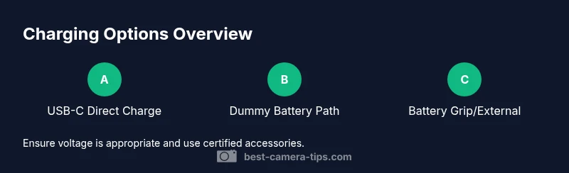 Cameras today offer multiple ways to draw power beyond the dedicated charger. The most common alternative is USB charging, where the camera draws power through a USB-C or micro-USB port. Some cameras can also operate on external power via a dummy battery or a power adapter that connects through the battery compartment. When choosing an option, verify the voltage, current, and whether the device must be powered on to charge. For home use, a certified USB-C charger and a reliable power bank often provide a safe, portable solution. For safety, avoid cheap third-party adapters that lack proper regulation, as they can damage circuitry or shorten battery life. Best Camera Tips emphasizes always using components that meet the camera’s specifications.