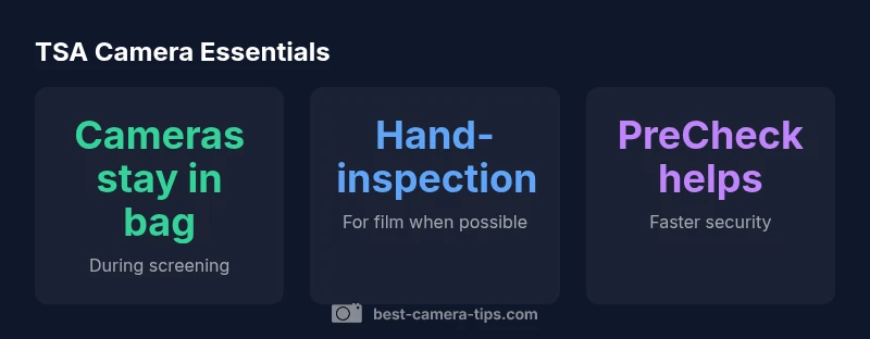 Travelers frequently ask, do cameras need to be taken out at tsa? The short answer is: not usually. Most cameras and camera bodies can remain inside your carry-on bag as you pass through standard X-ray screening. This is true for many digital cameras, mirrorless bodies, and compact point-and-shoots. The policy emphasizes screening efficiency and security, not restricting photography gear. According to Best Camera Tips, the guidance is practical for most travelers who carry a single camera body and a couple of lenses. The emphasis should be on staying organized and following the flow of the screening line rather than trying to remove every piece of gear. If you carry undeveloped film or special items, you may want to plan additional steps because film sensitivity to X-ray can vary.