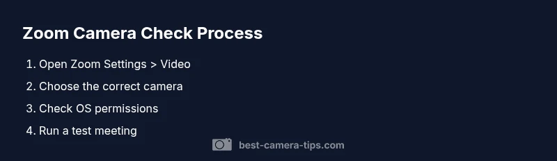 Checking your camera on Zoom means ensuring the hardware is connected, Zoom has permission to access the camera, and the correct camera is selected within the app. This process matters because a misconfigured input or blocked permission can leave you with a blank screen or cropped video. According to Best Camera Tips, start with the basics: confirm the camera is detected by your operating system, then confirm Zoom can access it. If you’re using an external webcam, verify it appears both in your system settings and in Zoom’s Video preferences. A smooth test drive now saves delays during real meetings.