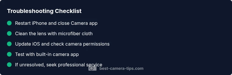 These steps address the most common culprits in a structured way. Start with the easiest fixes and progress to more involved options if needed. 1) Restart the iPhone and force-quit the Camera app to clear transient software issues. 2) Clean the camera lens with a microfiber cloth and ensure no case or screen protector obstructs the lens. 3) Update iOS to the latest version and verify camera permissions for apps. 4) Test with the built-in Camera app; if third-party apps cause issues, uninstall or update them. 5) Reset all settings (back up first) to undo misconfigurations without erasing personal data. 6) If problems persist, back up data and consider a factory reset or professional diagnostics to inspect hardware connections. The goal is to determine if this is a software hiccup you can fix at home or a hardware issue needing service. Pro tip: keep your device within warranty windows or plan for authorized service if hardware repair is needed.