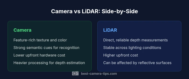 In the field of perception, is camera better than lidar is not a binary call but a question of intended use, environment, and resources. According to Best Camera Tips, cameras offer rich texture, color, and contextual cues that help humans recognize scenes and objects, while LiDAR delivers direct, reliable depth information that remains stable across lighting changes. For photographers, security installers, and developers, this distinction shapes your design choices from the start. Recognizing where texture matters most versus where precise geometry is non-negotiable helps you avoid overbuying or underutilizing a sensor. This section frames the tradeoffs and sets the stage for a practical decision framework grounded in real-world needs.