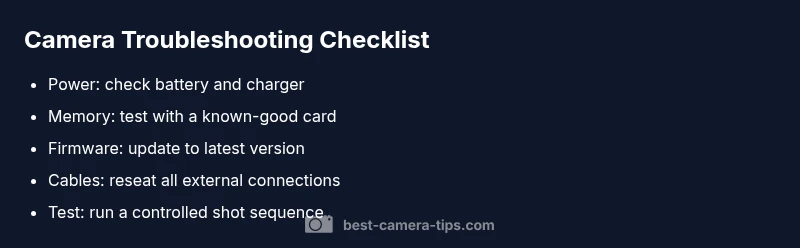 A structured approach helps you isolate issues quickly. Start with the power source, then test with a known-good memory card, perform a factory reset, and finally update firmware. Capture several test shots under controlled lighting to observe behavior. If you still see errors, document the exact sequence that triggers the fault and consult the manufacturer’s troubleshooting guide. This disciplined approach reduces downtime and helps you communicate clearly with support.