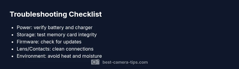 Start with the basics: power, storage, and firmware. Check the battery, try a fresh memory card, and reset minor settings. If the issue persists, follow the diagnostic flow to isolate the symptom and determine the precise fix. Time-sensitive gear calls for a calm, methodical approach.