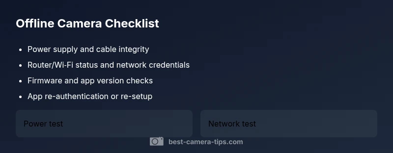 If your camera is offline, the two most common causes are a power issue or a network problem. This quick guide explains why camera is offline and provides an immediate fix to restore connectivity. Start with power checks, then verify your Wi‑Fi or Ethernet link, and finally re-seat cables or reconnect the device in the app. If this doesn’t fix it, move to firmware and service-status checks.