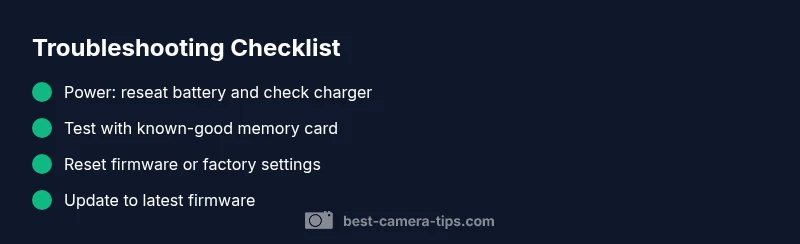 Keep this concise, printer-friendly checklist handy. It covers the most common causes and lets you verify steps quickly, so you don’t miss something obvious. Print it or save as a note on your phone, then run through in order: power and battery seating, remove/inspect memory card, test with a different lens or mount, update firmware if available, reset to factory settings after backing up data, verify cables and connections, note any error messages and indicators, and contact support if unresolved.
