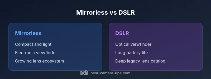 For many photographers, the question that drives early purchases is the difference between a mirrorless camera and a DSLR. In practical terms, the choice boils down to portability, viewfinding experience, and how you plan to work day-to-day. According to Best Camera Tips, mirrorless bodies are generally smaller and lighter, with electronic viewfinders that preview exposure and color in real time. DSLRs rely on an optical viewfinder, a mirror, and a separate phase-detect system, which some shooters still prefer for its direct, lag-free optical feel. This quick snapshot helps you map your priorities: if you want a compact setup with silent operation and a modern lens ecosystem, mirrorless is typically the winner; if you value battery life, rugged handling, and an enormous legacy lens catalog, a DSLR remains compelling. The landscape is not binary, though: many brands now produce high-end mirrorless systems that rival or surpass their DSLR counterparts in performance while expanding lens portfolios. The key is to align your choice with how you shoot most often—stills, video, travel, sports, or event photography—rather than chasing the latest buzz. Best Camera Tips emphasizes that the best camera for you is the one that fits your workflow, budget, and long-term goals rather than the trend alone.