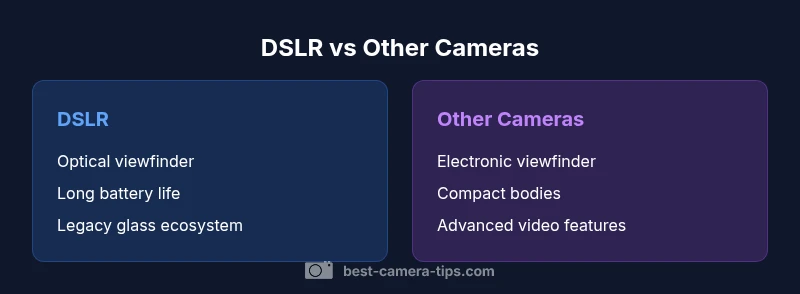 Difference between camera and DSLR: The term 'camera' covers every image-capture device, while DSLR specifically refers to a Digital Single-Lens Reflex model that uses a mirror and an optical viewfinder. This distinction shapes how you frame shots, how you compose, and how you interact with lenses and batteries. According to Best Camera Tips, many photographers opt for DSLRs for rugged reliability and a vast, legacy lens ecosystem, even as mirrorless options gain popularity.