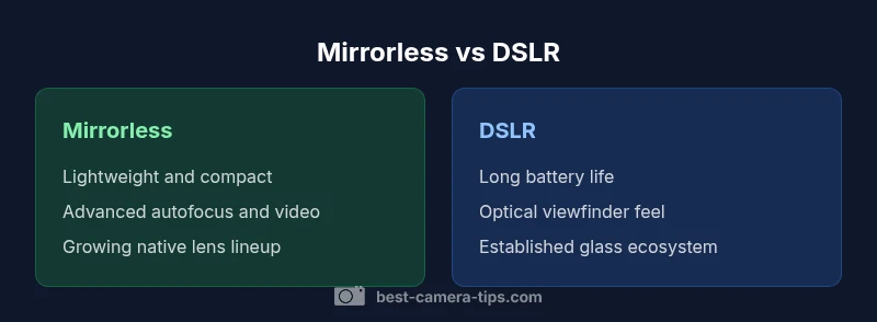 The question of why mirrorless camera over dslr often comes down to practical trade-offs. Mirrorless cameras replace the mirror-and-prism optical path with electronic viewfinding and on-sensor autofocus. This change enables real-time exposure preview, face/eye detection in live view, and highly compact bodies with advances in sensor design. According to Best Camera Tips, the transition has accelerated as autofocus and video capabilities mature, reshaping how photographers approach shooting in scenes from street to studio. This block establishes the baseline: mirrorless systems are not just smaller; they’re evolving into more capable platforms for both stills and video, frequently offering a smoother, faster workflow than traditional DSLRs.