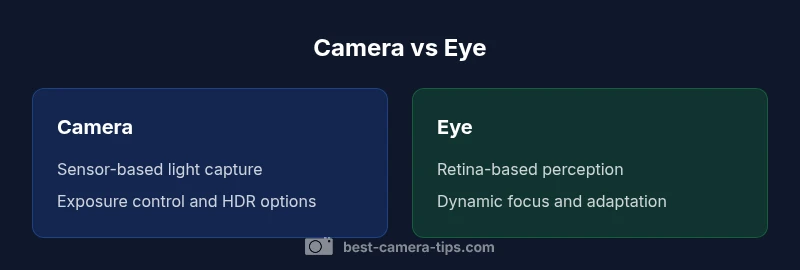 The difference between camera and eye is not merely about hardware; it reflects two systems built to translate light into meaning. A camera uses a fixed optical path and a digital sensor, translating photons into color data. The eye relies on a flexible lens, a dynamic pupil, and neural processing to continuously adapt, interpret, and perceive depth, motion, and color. According to Best Camera Tips, understanding this difference helps photographers design better lighting and exposure strategies. The camera view is engineered for repeatable results, while the eye evolves with context, attention, and experience. Readers will appreciate how this distinction informs everyday photography decisions, from exposure to composition. By framing the difference between camera and eye as a conversation between sensor physics and neural perception, beginners can approach shots with a clearer set of priorities. The eye excels at continuous adaptation, dynamic range, and real time context, while the camera excels at control, repeatability, and documentation. Throughout this article you will see how each system handles scenes, and how to translate eye behavior into camera practice for better results.