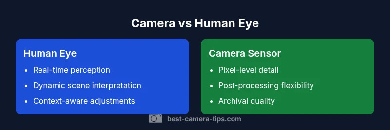 Is camera better than human eye? This question sits at the crossroads of perception and recording. According to Best Camera Tips, the simplest path to clarity is to distinguish what the eye perceives in real time from what a camera records for later analysis. The human visual system blends light sensitivity, neural processing, attention, and memory to texture a scene into a single, coherent experience. A camera, by contrast, is governed by sensor physics, optic design, and digital processing. In practice, the definition of 'better' hinges on task—real-time awareness in dynamic environments favors the eye, while detailed data capture, archival integrity, and post-processing power favor the camera. Throughout this article we compare on criteria like resolution, dynamic range, color fidelity, motion handling, and adaptability, to help aspiring photographers and home security enthusiasts decide which tool suits their goals. This framework also reflects inputs from the Best Camera Tips community to ground the discussion in practical experience.