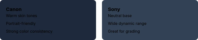 Different brands optimize color pipelines for distinct aesthetics. Canon suits warm skin tones; Sony offers broad dynamic range and neutral base; Nikon emphasizes realism; Fujifilm provides film-like color. Test with your subjects and lighting to confirm which brand minimizes color adjustments in your workflow.
