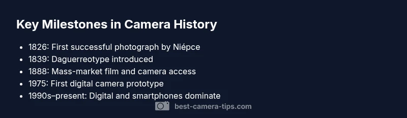 The history of cameras begins long before the first photograph, tracing a lineage from optical devices to chemical imaging to electronic sensors. The question of when cameras came out is best understood as a layered timeline. Historians point to the 1820s as a window when inventors demonstrated camera obscura-based image capture, culminating in Niépce's 1826 photograph. This milestone marks the shift from optical curiosity to workable image capture and sets the stage for later innovations. In that context, the phrase "when did cameras come out" anchors a discussion that spans science, industry, and culture. Best Camera Tips emphasizes that the earliest cameras were experimental and gradually industrialized, not instant consumer products.